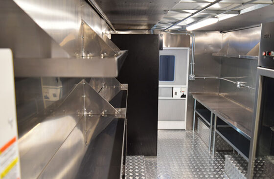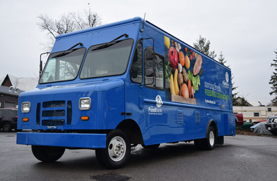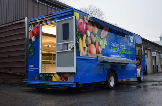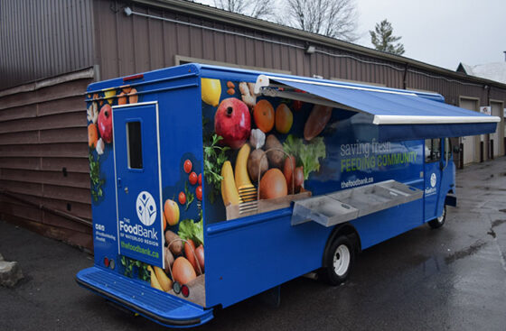 A fresh grocery donation vehicle that allows patrons to shop inside or out. A removable rack and basket system allows for each display of produce. At the end of the day, the racks can be brought inside the truck and stacked. They also opted for an inverter system which is used to keep the fridges cold between locations. We appreciate the work our local food banks do to ensure no in our community goes hungry.